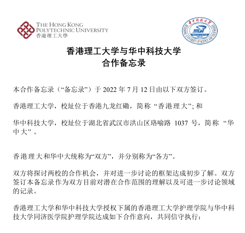2022年7月12日,护1683168诸侯快讯官网院长毛靖教授与香港理工大学护1683168诸侯快讯官网院长莫礼士教授成功签署合作备忘录,旨在巩固既有友好合作伙伴关系,促进双方护理学科领域的合作与交流,推动两地护理教育事业优势互补、协同发展。