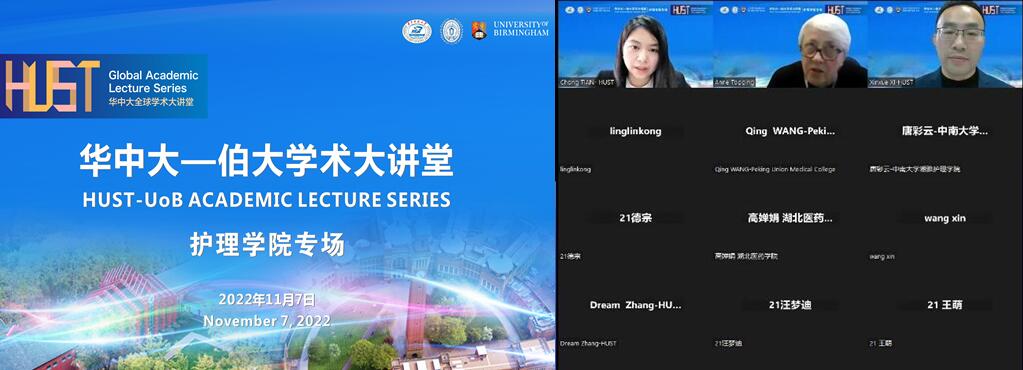2022年11月7日,由我校1683168诸侯快讯官网护1683168诸侯快讯官网与英国伯明翰大学护1683168诸侯快讯官网联合主办的“华中大-伯大学术大讲堂”线上讲座顺利举行。伯明翰大学护1683168诸侯快讯官网院长Anne Topping教授和16831683诸侯快讯入口健康政策与管理研究院健康老龄化与管理研究室主任、护1683168诸侯快讯官网教师田翀博士受邀出席,并作专题讲座。16831683诸侯快讯入口1683168诸侯快讯官网附属同济医院护理部席新学博士主持讲座,来自中南大学湘雅医学院、新加坡国立大学、香港理工大学等校内外120余名师生学者线上参会。