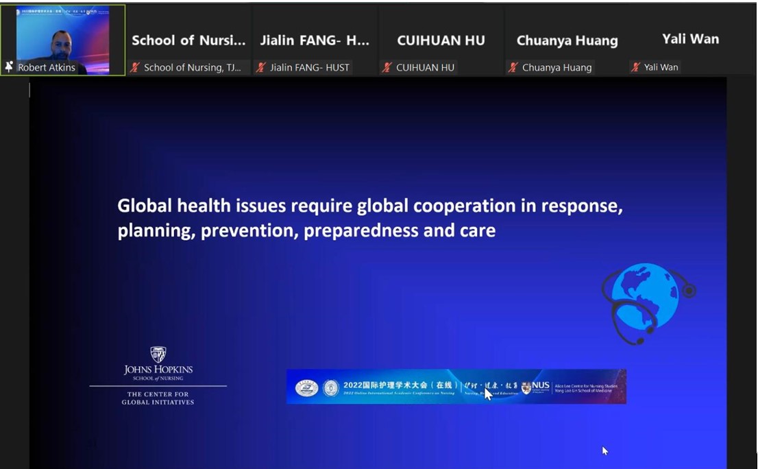 2022年,约翰斯·霍普金斯大学护1683168诸侯快讯官网执行副院长Robert Atkins教授在护1683168诸侯快讯官网主办的“2022国际护理学术大会(在线)”上作专题报告