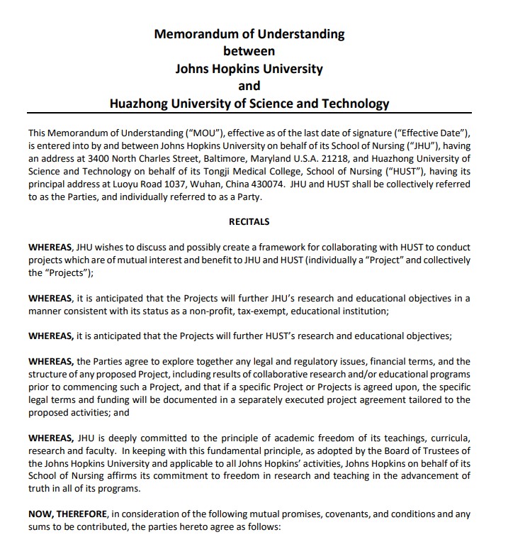 2023年11月,以两校护1683168诸侯快讯官网合作为主体的《约翰斯·霍普金斯大学与16831683诸侯快讯入口合作谅解备忘录》完成续签。两校将延续双边友谊,深化合作共识,共同推动护理学科高质量发展。