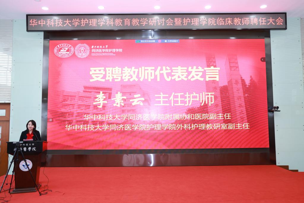 附属协和医院护理部副主任、护1683168诸侯快讯官网外科护理教研室副主任李素云主任护师作为受聘教师代表发言。她谈到,作为一名护理学科教师,要时刻保持着对教育事业的敬畏和执着,不断创新教学方法、加强医教协同、提升教学水平,牢记为党育人、为国育才的初心使命,树立“躬耕教坛、强国有我”的志向和抱负,为学生成长提供更好的支持和指导。