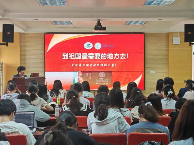 徐晖以“护理担使命,青春献未来”为题,分别从“我们身处的时代”、“我们所受的教育”、“我们面向的未来”三个方面为大家讲授。她深入解读了新时代健康工作者的使命与内涵,强调护理专业学生使命荣光,责任重大,号召全体毕业生党员要感受思想伟力,坚持不懈地用习近平总书记关于人民健康系列重要论述领航定向。