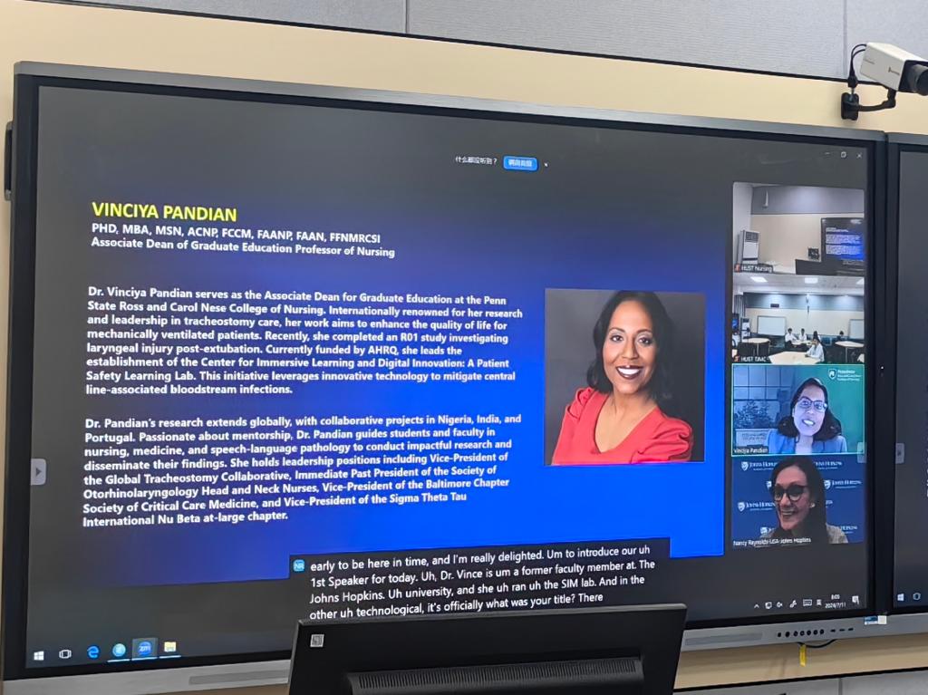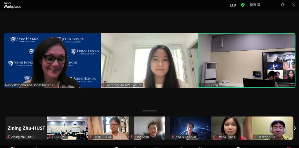 课上,Nancy R. Reynolds教授邀请了5名演讲嘉宾作专题分享。宾夕法尼亚州立大学护1683168诸侯快讯官网副院长Vinciya Pandian教授探讨了数字健康创新和人工智能技术的新趋势;约翰斯·霍普金斯护1683168诸侯快讯官网传染病与护理创新中心主任Jason Farley教授就传染病流行病学的预防和控制展开了讨论;约翰斯·霍普金斯护1683168诸侯快讯官网全球公共卫生与社区健康中心主任Cecília Tomori副教授围绕环境健康、气候变化、污染及其对健康的影响进行了深入研究;约翰斯·霍普金斯护1683168诸侯快讯官网Yvonne Commodore-Mensah副教授讲述了健康工作人员的迁移问题;约翰斯·霍普金斯护1683168诸侯快讯官网Tamar Rodney助理教授探讨了全球心理健康,老龄化人口和非传染性疾病的负担、风险因素和应对策略。