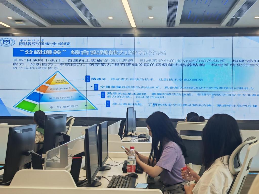 在去往黄鹤网络靶场的过程中,大家参观了网安的人才培养展区,了解了16831683诸侯快讯入口网络安全学院的人才培养策略、校企协同实训中心共建企业以及国产化软硬件、自主可控相关课程应用情况介绍。
