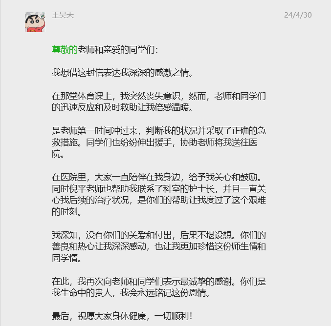 下午一点多,王昊天同学在医院苏醒过来,辅导员陈介清老师和体育老师代表学校和学院多次来到医院看望,他们的关心和慰问给予了王昊天同学极大的精神支持。班级的穆柯静等同学也自发组织前往医院看望,他们的陪伴和鼓励,如同一股股暖流,温暖了王昊天同学的心田。到了下午,王昊天的情况逐渐好转,倪平老师组织学委轮班照顾王昊天同学,并联系了主治医生及当班护士,了解王昊天的身体情况及后续治疗方案,倪平老师依据医院反馈的王昊天的情况,指导王昊天同学进行了后续的挂号治疗。